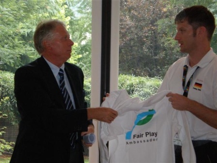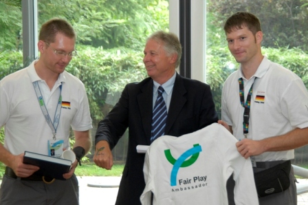 Oliver Buttler und Dennis Buttler überreichten dem Deutschen Botschafter Dr. Michael Schäfer einen Fair Play Ambassador Pulli von Nike. Das Fair Play Tattoo auf der Hand konnte jeder beim Händeschütteln in den kommenden Tagen sehen.