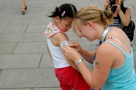 Ein großes Vorhaben, das sich die jungen Fair Play Botschafter vorgenommen hatten. Aber um so mehr die Botschafter auf Pekings Straßen und in den Stadien unterwegs waren, sie wurden bereits von weitem als „die Fair Play Botschafter“ freudig begrüßt. So schmückten sich innerhalb kürzester Zeit Athleten, Zuschauer und Einheimische mit den Tattoos, die auf dem Oberarm, der Hand oder gar im Gesicht angebracht worden waren.
